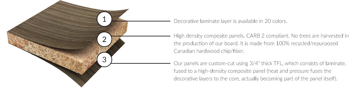 Our TFL is made in the United States from 100% repurposed, recaptured Canadian and U.S. hardwood chips and fibers. That means you get a sustainable closet system that looks amazing, lasts for years, and helps you feel good about your choice.